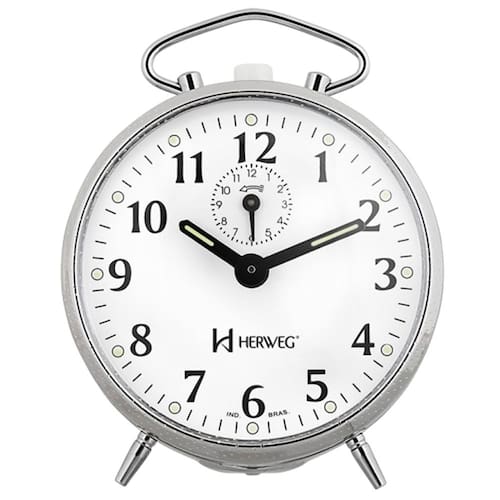 Despertador Mecânico - 2210 Estilo: Clássico Medidas: Altura do relógio: 10 cm com alça levantada 11,8 cm Largura do relógio: 10 cm Espessura do relógio: 4,3 cm com botões traseiros 5,5 cm Características Técnicas: Alarme com som campainha Funcionamento Mecânico Cores Disponíveis: Prata Cromado Mais Informações sobre o produto Relógio Despertador Mecânico a cordas Base em Metal Visor de acrílico Ponteiro com massa luminosa Noturna Mostrador com massa luminosa Noturna Botões de regulagem na parte traseira Ean: 7897280314681