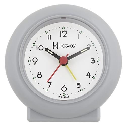 Modelo: 2611-024 Estilo: Decorativo Medidas: Altura: 8,0 cm Largura:9,5 cm Características Técnicas: Usa pilha AA não acompanha produto Cor: Cinza Função: Despertador Tipo: Anológico Formato: Redondo Quartz Marca: Não Informado