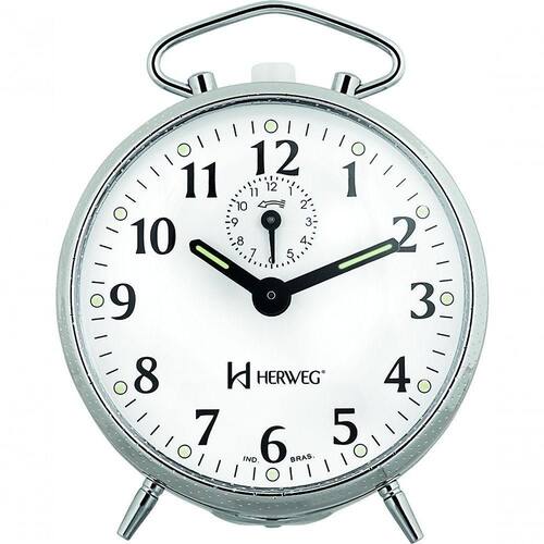 Relógio Despertador Mecânico A Cordas Cromado Herweg 2210-207 único Relógio Despertador Mecânico A Cordas Cromado Herweg 2210-207 único - Características Gerais do Produto: - Acabamento / funcionalidades: Cromado Picoteado - Alimentação: A corda - Características técnicas: Mecânico; Alarme com som campainha; Ponteiros com massa luminosa; Mostrador fosforescente - Material: Visor de Acrílico; Detalhes cromados; Metal Cromado - Medidas: 12A x 9L x 6E cm - Observações: Botões de regulagem na parte traseira e na parte superior do produto. - Modelo referência do produto: 2210-207 Acompanha o produto: - 01 Relógio Despertador - Eletrônica - Garantia de 12 meses do Fabricante - Embalagem - Manual de Instruções Garantia: - 12 Meses de Garantia de