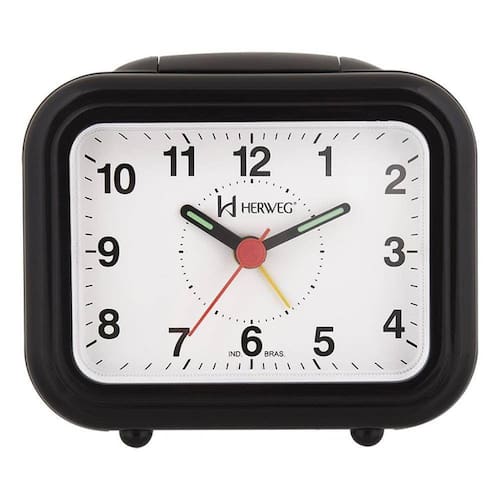 Relógio Despertador Quartz Tradicional Herweg 263034 Estilo Tradicional, Lindo Relógio Decorativo. Com Tradição E Qualidade Da Marca Herweg, Desde 1952 Dedicando Seu Tempo Ao Tempo. Base Em Plástico Injetado Visor De Acrílico Ponteiro Com Massa Luminosa Botões De Regulagem Na Parte Traseira e Superior Do Produto Alarme Com Som Crescente Iluminação Noturna Usa Pilha AA Snooze Soneca Mecanismo Step Cor: Preto Medidas: Altura: 9 Cm Largura: 7 Cm Profundidade: 4 Cm.