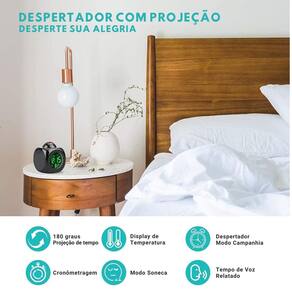 Nosso relógio não só fala a hora para você, como também projeta os detalhes na parede ou teto, tudo isso com clareza cristalina graças à sua tecnologia de projeção de 180 graus e um display LCD que mostra tempo, temperatura e alarme.
