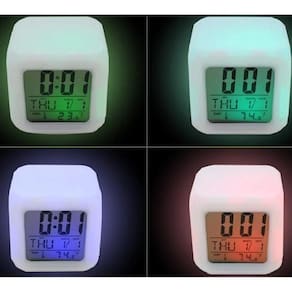 Lindo relógio em formato de cubo com luzes LED colorido para alegrar e decorar qualquer ambienteRelógio e luminária, Cubo com luzes Coloridas em Led, Despertador e Termômetro 5x1Este moderno e elegante relógio Luminária de mesa com formato de cubo com led colorido, contém 5 funções (5x1).Possui mudança automática de 7 cores (LED) diferentes e você pode desligar quando quiser, marca a hora; data; semana; temperatura e também funciona como luminária. Suporta os formatos 12 e 24H. Função alarme e soneca com 8 musicas diferentes e o visor informa a temperatura em ºC e ºF.Informações sobre o produto:Horário 12H ou 24HDespertadorTemperaturaDia e mêsDia da semanaAltura: 8cmComprimento: 8cmLargura: 8cm7 cores de LED (Muda automaticamente)Luzes LED funciona com 3 pilhas AAA (Não incluso)Cor do cubo: BrancoCOR do LED: RGBDimensões: 8 × 8 × 8 cmPeso: 125 gr.Tela: LCD com tamanho 5.1 x 5.1 cmVoltagem: 4,5v (fonte não inclusa) (Ja testei com a fonte do celular Nokia)LCD com 2 baterias AG13/1mA (incluso)LEDs com 4 pilas AAA ou adaptador de 4,5V (não incluso) Marca: Tempo Real