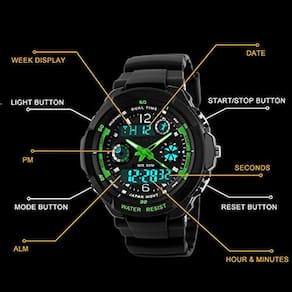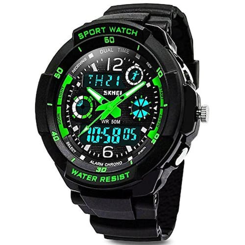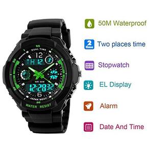 Relógio digital esportivo infantil - relógios esportivos analógicos à prova d'água para meninos com alarme, relógio LED para crianças. Os relógios infantis são formas muito eficazes de ensinar seus filhos a ver as horas. Na verdade, eles podem ensinar mais a seus filhos sobre gerenciamento de tempo e ajudá-los a ler o tempo analógico. Nosso relógio digital esportivo infantil é simplesmente o melhor presente para as crianças que você ama. Características: pulseira de resina PU de alta qualidade Função de alarme Hora, semana, data, cronômetro, função que brilha no escuro Fuso horário duplo, display analógico e digital Concha de material de PC rígido e durável Design à prova d'água de 50 m Especificação: comprimento da pulseira: aproximadamente 9 polegadas (23 cm) Largura da pulseira: 0,71 pol (1,8 cm) aproximadamente. Espessura da caixa: 0,62 pol. (1,6) cm) aproximadamente. Diâmetro da caixa: 1,65 pol. (4,2 cm) aproximadamente. Ajuste máximo do pulso: 7,48 pol. (19 cm) aproximadamente. Ajuste mínimo do pulso: 5,51 pol. (14 cm) aproximadamente. Impermeável: 50 mNota: Não pressione nenhum botão Regue ou use este relógio para atividades subaquáticas de longa duração. Conteúdo da embalagem: 1 × relógio 1 × caixa de presente
