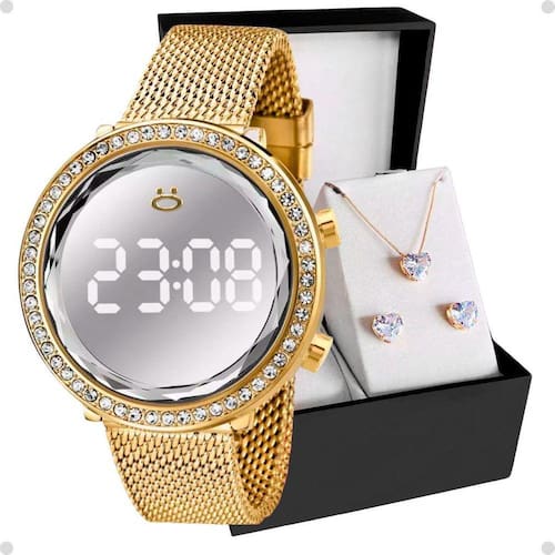 Relogio digital feminino aço + caixa + colar strass brinco Kit Maria Premium - Relógio Orizom Maria + Colar e Brincos Banhados