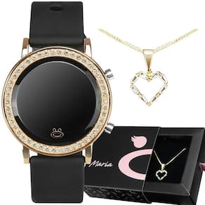 Relogio Digital Feminino Banhado Aço Inox + Colar Coração Social Moda Stras Casual Preto Kit Luxo Maria - Relógio Digital Orizom Maria Preto com Detalhes Dourados + Colar Banhado 18k com Pingente de Coração + Caixa Premium