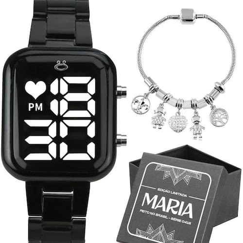 Relogio Digital Feminino Preto + Pulseira Pandora Casual Kit de Presente Orizom Maria - Relógio Feminino Digital e Pulseira Aproveite a oportunidade de presentear a pessoa amada com o Kit de Presente Orizom Maria! Este kit contém um elegante Relógio Feminino Digital da linha Orizom Maria, com um design quadrado e cor preto (Black Piano) feito de aço inoxidável e uma pulseira estilo Pandora de cor prata, também feita de aço inoxidável, com aproximadamente 21 cm de comprimento.