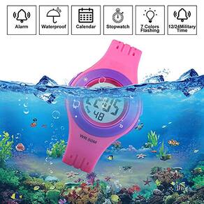 ?À prova d'água para uso diário?: ? Resistente à água de 50 m/165 pés ?, sem problemas na lavagem diária das mãos e na natação. Sinta-se à vontade para usar o relógio ao tomar banho, nadar e mergulhar. NOTA: NUNCA pressione nenhum botão na água ou use este relógio para atividades subaquáticas de longa duração, como mergulho, etc. ?? É ALTAMENTE RECOMENDÁVEL TIRAR O RELÓGIO ANTES DAS ATIVIDADES AQUÁTICAS, POIS AS CRIANÇAS PODEM APERTAR OS QUATRO BOTÕES POR ACIDENTE. ??