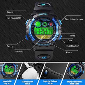 Luzes noturnas LED de 7 cores: tenha 7 cores diferentes para a luz noturna LED do relógio, você pode configurá-la como quiser, o que a tornará mais personalizada. Diferentes cores de luz podem trazer muita diversão para as crianças. Relógio digital infantil multifuncional: este é um relógio digital infantil multifuncional, as funções incluem: antimagnético, antivibração, alarme, cronômetro, data e semana e calendário, luz noturna LED. Essas características atenderão às diferentes necessidades das crianças e trarão felicidade ilimitada às crianças. 50M Resistente à água: 50M Resistente à água: uso diário à prova d'água, lavar à mão, tomar banho, nadar, sem problemas. (Por favor, NÃO PUXE os botões debaixo d'água) Mas é altamente recomendável tirar o relógio antes das atividades aquáticas, pois as crianças podem tocar nos botões acidentalmente ao brincar na água. Material: Material da caixa: PC Material da pulseira: silicone Superfície do espelho: vidro de resina altamente transparente Tamanho: Estilo 1/2: Diâmetro da caixa do mostrador: 1,50 polegadas/3,8 cm Espessura da caixa do mostrador: 0,39 polegadas/1,0 cm Largura da pulseira: 0,63 polegadas/1,6 cm Comprimento da pulseira: 9,05 polegadas/23 cm Adequado para circunstâncias de pulso de 5,7 pol/14,5 cm/8,46 pol/21,5 cm Tipo de fecho da pulseira: Peso do relógio de fivela: 1,09 onças/31gEstilo 3: Diâmetro da caixa do mostrador: 1,7 polegadas/4,3 cm Espessura da caixa do mostrador: 0,63 polegadas/1,6 cm Largura da pulseira: 0,71 polegadas/1,8 cm Comprimento da pulseira: 9,64 polegadas/24,5 para pulso de 15 cm/5,9 polegadas a 23 cm/9,06 pol.