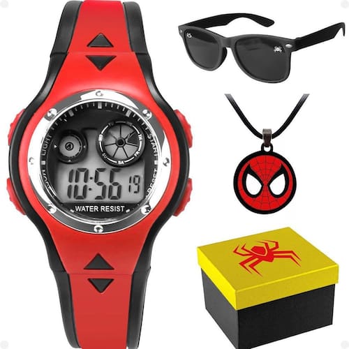 Relogio digital infantil + colar caixa vermelho ajustavel heroi casual homem aranha preto social Kit Infantil Homem-Aranha - Relógio Digital, Óculos, Colar e Caixa Premium Adquira já este incrível kit infantil do Homem-Aranha e proporcione momentos incríveis para o seu filho O kit é composto por: - Relógio Infantil Digital: Com design vermelho e preto e luz de LED, é perfeito para facilitar a visualização das horas no escuro. Resistente e ajustável, é ideal para o dia a dia das crianças. - Óculos Infantil: Com e hastes em acetato preto e lentes pretas com proteção UV, o visual do Homem-Aranha aplicado à completa o estilo do seu pequeno fã. - Colar Infantil: Feito de elástico resistente, ajustável e com pingentes exclusivos do Homem-Aranha, é o acessório perfeito para acrescentar um toque de personalidade ao visual. - Caixa Premium: Com o símbolo do Homem-Aranha recortado a laser, a caixa de alta qualidade torna o presente ainda mais especial e memorável. Marca: Não Informado Ean: 7892910879912