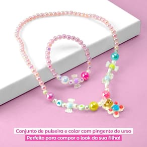 Os óculos de sol infantis são perfeitos para proteger os olhos das crianças, com lentes que ajudam na proteção contra os raios solares. Além disso, o kit inclui um colar de miçangas coloridas e uma pulseira combinando, perfeitos para dar um toque especial ao look das crianças.
