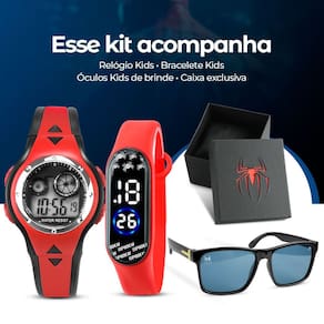 Kit Homem-Aranha - Relógio, Óculos e Caixa Premium OrizomEste incrível kit temático do Homem-Aranha é perfeito para os fãs do super-herói aracnídeo! Com itens de alta qualidade e design exclusivo, este conjunto é ideal para crianças que desejam estilo e diversão. O kit inclui:1 Relógio Digital Infantil Vermelho com Detalhes Pretos, Qualidade Premium, Pulseira em Silicone Ajustável - Com design temático do Homem-Aranha, este relógio combina estilo e conforto. Sua pulseira ajustável em silicone vermelho com temática do Homem-Aranha se adapta a qualquer tamanho de pulso infantil, garantindo praticidade e durabilidade. IMPORTANTE: Esse relógio não é a prova de água!1 Relógio Digital em Formato Bracelete do Homem-Aranha - Este relógio em formato de bracelete é todo vermelho, com o emblema do Homem-Aranha e detalhes temáticos. Ele é perfeito para os pequenos heróis. Esse relógio É a prova de água!1 Óculos de Sol com Proteção UV - Proteja seus olhos do sol enquanto exibe o seu amor pelo Homem-Aranha com esses óculos de sol com tema do super-herói. Eles também possuem proteção UV para manter seus olhos seguros.1 Caixa Premium Orizom Kids com Tema do Homem-Aranha - Guarde todos esses itens com estilo na caixa premium Orizom Kids, decorada com o tema do Homem-Aranha. Ela é perfeita para manter seus acessórios organizados e protegidos.Este kit é ideal para presentear ou para colecionadores de itens do Homem-Aranha. Leve para casa o seu kit hoje mesmo e mostre o seu espírito heroico.