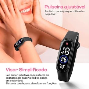 - Relógio Digital Infantil Orizom Kids: com pulseira ajustável de silicone, cor preta, strass vermelha e desenho de borboleta no display.