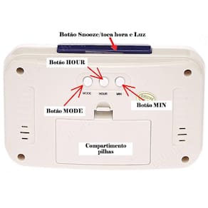 Função SNOOZE/SONECA: toca o despertador a cada 10 minutos após o toque configurado e durante 6 vezes (1 hora), mas pode ser configurado para não tocar a soneca, também pode-se desligar a SONECA clicando no botão traseiro;