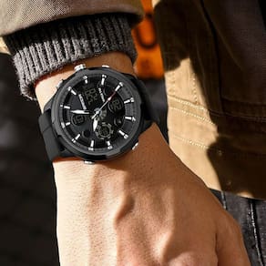 Projetado para o homem moderno que busca desempenho e estilo. Com movimento de quartzo de alta precisão, este relógio oferece resistência à água, tornando-o ideal para atividades ao ar livre e esportes. Possui um design robusto e elegante, com uma pulseira confortável e durável, além de recursos como cronômetro e iluminação noturna para garantir visibilidade em qualquer condição. Perfeito para quem valoriza funcionalidade e estética em um só acessório.