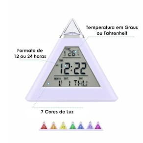 Relogio Digital Piramide De Mesa Calendario Despertador Termometro Cabeceira Cor:banco Relogio Digital Pirâmide De Mesa Calendario Despertador Termometro Cabeceira O Relógio Digital Triangular é multifuncional podendo lhe oferecer diversas funções como: temperatura, hora, calendário do dia, alarme, função soneca. É um ótimo item de decoração, com diversas funções para ajudar no seu dia a dia.