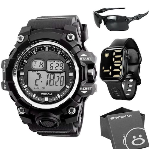 Relogio Digital Prova Dagua + Caixa + Oculos Proteção Uv Kit de Acessórios Estilosos Orizom Spaceman Adicione um toque de modernidade e funcionalidade ao seu visual com este conjunto exclusivo de acessórios Orizom Spaceman. Ideal para presentear a si mesmo ou alguém especial.