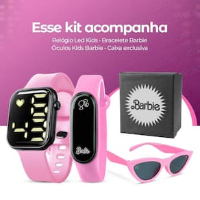 - Relógio Digital Rosa à Prova D'Água com Pulseira Ajustável: R 79,99 - Relógio Digital Rosa com Temática da Barbie e Pulseira em Formato de Bracelete: R 89,99 - Óculos de Sol Vintage Rosa da Barbie com Proteção UV: R 49,99 - Caixa Premium Barbie: Incluída gratuitamente Ean: 7894561472894
