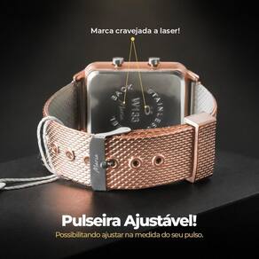 Com seu design quadrado e visor LED bem visível, este relógio oferece uma experiência contemporânea incomparável. Seu charmoso tom rose e pulseira ajustável de silicone garantem conforto e um toque de delicadeza, tornando-o adequado para eventos formais ou encontros casuais.