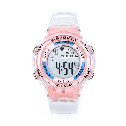 Relógio S510-03-1 O Relógio Digital Rosa Transparente combina estilo esportivo com um visual moderno e delicado, ideal para crianças e adolescentes. Seu design transparente com detalhes em rosa deixa o relógio mais bonito e diferente.\nConta com display digital grande e fácil de visualizar, permitindo que as crianças acompanhem as horas com facilidade no dia a dia. Possui também funções úteis como alarme, cronômetro e calendário, além de luz LED para visualizar as horas no escuro.\nO modelo possui resistência à água de até 50 metros (WR50M), sendo ideal para uso diário.