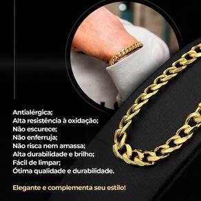 A corrente incluída neste conjunto é uma peça impressionante por si só, com cerca de 60cm de comprimento e feita em aço inoxidável banhado. Sua robustez e elegância a tornam perfeita para complementar o visual masculino, adicionando um toque de sofisticação.