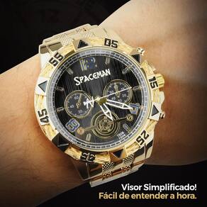 - Relógio Masculino Analógico Orizom Spaceman com temática de Dragão: Seja encantado pelo design todo dourado e detalhes meticulosos de um dragão que adicionam um toque de mistério e poder ao seu pulso.
