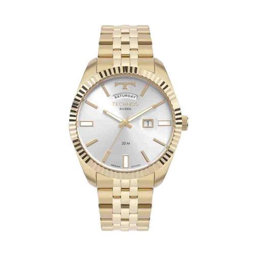 Relógio Dourado Masculino Technos Riviera 2350AJ/1KDos clássicos aos modernos, os relógios têm muito a dizer sobre a sua personalidade. Nossos modelos casuais possuem um design inovador e complementam seu estilo.ESPECIFICAÇÕES TÉCNICAS- Marca: Technos- Gênero: Masculino- Tipo de mostrador: Analógico- Função: Calendário com dia do mês e da semana- Tipo de fecho: Dobrável com trava e botão lateral- Cor da caixa: Dourado- Cor do mostrador: Prata- Cor da pulseira: Dourado- Material da caixa: Aço inox- Material da pulseira: Aço inox- Largura da caixa: 4,3 cm- Resistência à água: 5 ATM 50m - Garantia: 12 meses