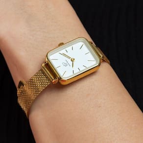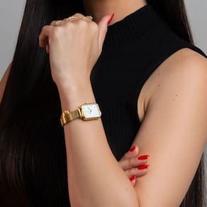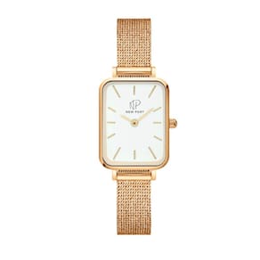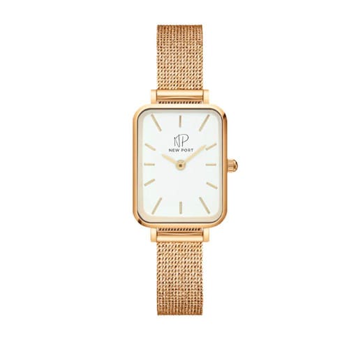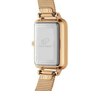 O Relógio Feminino New Port Quadrado Vermont Gold, com sua pulseira de aço inoxidável dourado, exibe dimensões de 20x26mm. A caixa é confeccionada em metal dourado, harmonizando com o mostrador branco protegido por um vidro de mineral resistente.