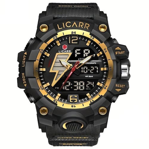 Imagine um relógio que combina inovação tecnológica com um estilo audacioso e moderno. Este relógio desportivo de exibição dupla para homens é a definição perfeita de uma peça atraente e funcional. Com um design que une o clássico ao contemporâneo, conta com a resistência necessária para acompanhar qualquer aventura, seja ao ar livre ou em ambientes mais urbanos, sem comprometer o estilo. Suas cores fortes, preto e vermelho, destacam a robustez do produto, enquanto a pulseira de borracha amplia o conforto e a praticidade.