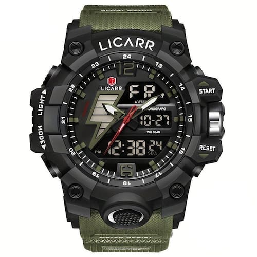 Além de sua aparência impressionante, a tecnologia integrada oferece o que há de mais avançado em termos de precisão e durabilidade. Equipado com movimento de quartzo e exibição LED, oferece leitura fácil e rápida do tempo, indispensável para o estilo de vida atarefado de hoje. Desempenha de forma excepcional em diversas situações, do modo militar ao cotidiano, resistindo sem perda de funcionalidade.