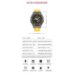 Descrição do produto:1. Marca: SMAEL2. Dual tempo mostra com função backlight LED3. água 30M resistente4. Type: Mulheres relógios desportivos5. Movimento: Movimento Japão Digital6. Existem 4 cores para seleçãoLargura 8. Band: (aproximadamente) 2.1cm9. Diâmetro do seletor: (aproximadamente) 4.5cm10. Strap Material: PU forteOnze. Material do Caso: Borracha forte + vidro endurecido alta resistênciaDoze. Fecho: FivelaTreze. Mostrando o tempo precisoCatorze. É bom presente para alguém especialNota: sugerimos que você não usá-lo quando nadar. Mas se você vai para nadar ou mergulhar, pls não pressione qualquer botão debaixo dágua!Componentes incluídos:-1 x relógio SMAEL genuíno-1 x Use Manualundefinedundefinedundefinedundefinedundefined