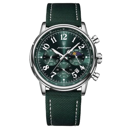 Especificações [Design Moderno]: O mostrador apresenta marcadores de algarismos arábicos que conferem um toque contemporâneo e fácil leitura, ideal para o cotidiano agitado. [Durabilidade Excepcional]: Com espessura de 13mm e um estojo feito em aço inoxidável, este relógio é construído para durar e resistir a desafios. [Funcionalidades Avançadas]: Equipado com cronógrafo, mãos luminosas e data automática, este relógio é mais que um acessório; é um gadget indispensável. [Resistência à Água]: Com resistência de até 3 Bar, este relógio é um verdadeiro companheiro em atividades aquáticas, seja na piscina ou no mar. [Estilo Incomparável]: Feito com pulseira de náilon de alta qualidade, proporciona uma estética esportiva enquanto mantém o conforto e a durabilidade.