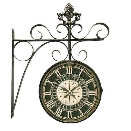 Relógio tipo estação, que é colocado na parede e permite a visualização das horas de ambos os lados, feito em metal.