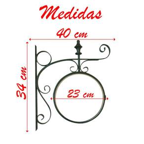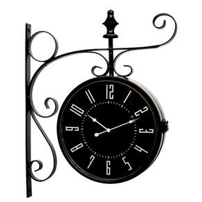 Relógio tipo estação, que é colocado na parede e permite a visualização das horas de ambos os lados, feito em metal.