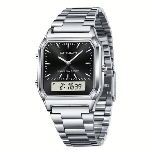 Especificações: [Material Premium] Pulseira feita em aço inoxidável, proporcionando resistência e um toque de sofisticação ideal para o uso diário sem perder o brilho . [Design Moderno] O estojo do relógio é fabricado em liga metálica, exibindo um mostrador quadrado único que se destaca por seu design o e contemporâneo. [Perfeito para Aventuras] Com resistência à água de até 50 metros, este relógio é ideal para acompanhá-lo em diversas situações, seja no trabalho ou outdoor. [Tecnologia Avançada] Equipado com movimento digital e modo de exibição duplo explícito, oferece precisão e facilidade na leitura do tempo a qualquer momento. [Alimentação Confiável] Funciona com bateria tipo botão de longo diâmetro, garantindo uma longa duração sem preocupações adicionais. Por que comprar isto?