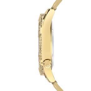Sua caixa em metal dourado apresenta linhas robustas e acabamento polido, conferindo presença e estilo ao pulso feminino. O mostrador dourado mantém uma leitura equilibrada e harmoniosa, com ponteiros bem definidos e layout clean, valorizando o conjunto sem excessos.
