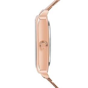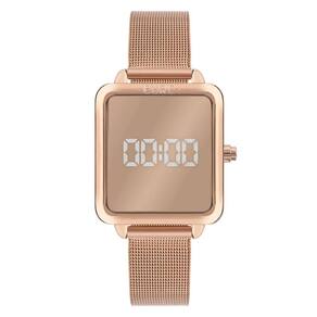 O modelo traz um visual contemporâneo com caixa retangular rosé, acabamento espelhado e visor digital com LED branco que só aparece quando ativado. A pulseira mesh em aço rosé garante um encaixe elegante ao pulso, enquanto o mostrador totalmente espelhado oferece um toque de modernidade e sofisticação.