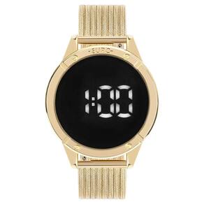 A coleção Fashion Fit da Euro inova com um modelo moderno e impactante: o relógio FF LED com mostrador touchscreen. Com caixa redonda de 41mm e acabamento dourado, este modelo chama atenção pela elegância minimalista e tecnologia intuitiva. Basta um toque para a hora aparecer no display em LED branco sobre o fundo preto.