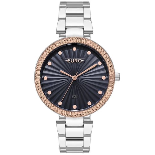 Elegante, moderno e com um toque de sofisticação, o Relógio Euro Glitz Bicolor é o acessório ideal para mulheres que buscam um estilo marcante. Com uma caixa de 40mm em metal prateado e aro rosé texturizado, o modelo chama atenção pelo contraste elegante entre os tons metálicos.