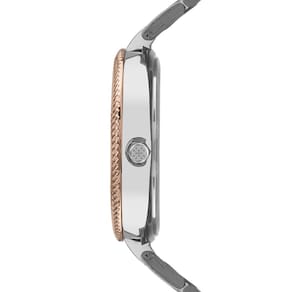 Sua pulseira em aço inox bicolor (prata com detalhes rosé) garante resistência, durabilidade e muito charme. Com resistência à água de até 50 metros, o modelo é ideal para o dia a dia com segurança.