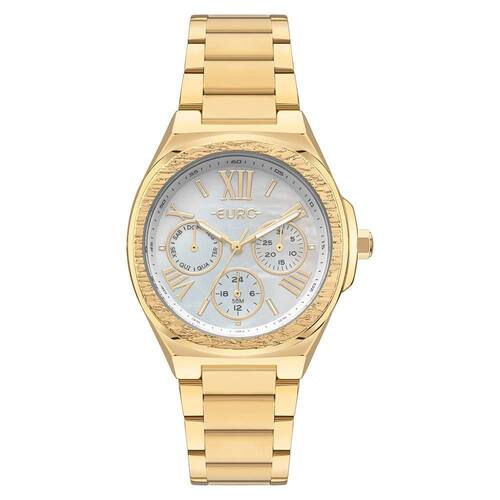Relógio Euro Feminino Multiglow Dourado - Eu6p79ag/4b Elegância que brilha em cada detalhe. Com caixa integrada e aro texturizado, o relógio ganha ainda mais charme com o mostrador com textura de madrepérola e número romanos ? um toque clássico com um glow moderno. O maquinismo multifunção traz funcionalidade sem perder o estilo. Versão em banho dourado. Cor da Caixa - Dourado Material da Caixa - Aço Formato da Caixa - Redondo Material da Pulseira - Aço Garantia - 12 meses Cor do Mostrador - Branco Cor da Pulseira - Dourado Largura da Caixa (cm) - 3,6 Resistente a Água - 5 ATM Descrição da Resistência - A resistência deste produto permite apenas respingos de água ao lavar as mãos. Não utilizar este produto em qualquer situação que haja contato direto com água. Cor - Dourado Tamanho - Médio Gênero - Feminino