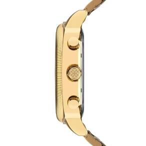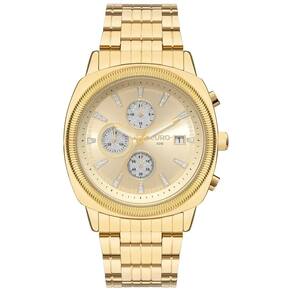 Sua caixa em metal dourado apresenta linhas robustas e acabamento polido, proporcionando um visual imponente e elegante. O mostrador dourado conta com submostradores multifunção, aplicações decorativas sutis e janela de data, garantindo praticidade no dia a dia sem abrir mão do estilo.