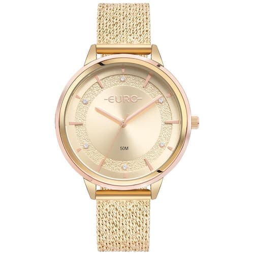 Relógio Euro Feminino Ref: Eu2035yvk/4j Fashion Mesh Dourado DESCRIÇÃO DO PRODUTO: Caixa de Metal Pulseira de Malha de Aço Mesh Vidro de Cristal Mineral Fundo Pressão Resistente à Água Até 5 Atm Diâmetro / Largura da Caixa: 40.00 MM Funções: Analógico Aro Rosé Mostrador champanhe com pedras Alimentação do Maquinário: Bateria Maquina Japonesa de 1 Ano Marca: Não Informado Ean: 7891530830563