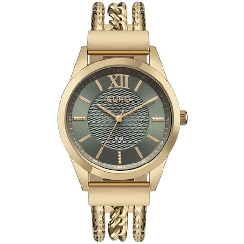 Relógio Euro Feminino Ref: Eu2035ywr/4v Bracelete Dourado DESCRIÇÃO DO PRODUTO: Caixa de Metal Pulseira de Metal estilo bracelete Vidro de Cristal Mineral Fundo Pressão Resistente à Água Até 5 Atm Diâmetro / Largura da Caixa: 40.00 MM Funções: Analógico, Bracelete Mostrador verde com algarismo romano Alimentação do Maquinário: Bateria Maquina Japonesa