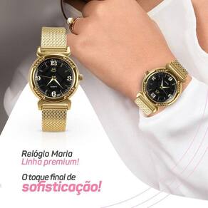 Relogio feminino aço dourado banhado silicone inox moda Eleve seu estilo com o Relógio Feminino Orizom Maria, uma fusão perfeita de luxo e personalidade. Este relógio exclusivo apresenta um design de dourado banhado com um fundo preto, emanando sofisticação e elegância. Seu maquinário em aço inoxidável garante precisão e durabilidade, enquanto a pulseira em silicone ajustável oferece conforto incomparável, adaptando-se a todos os tamanhos de pulso com facilidade. Além disso, vem acompanhado de uma elegante caixa premium Orizom Maria, proporcionando segurança e estilo ao guardar o relógio.
