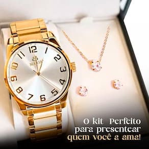 Surpreenda a Maria da sua vida com este conjunto deslumbrante, projetado para realçar a elegância e o estilo dela. O Relógio Feminino Analógico Orizom Maria é uma verdadeira obra-prima, banhado em ouro e feito com aço inoxidável de alta durabilidade, enquanto o colar banhado em ouro adiciona charme e requinte ao visual. O pingente e o par de brincos em forma de coração, adornados com strass transparente, simbolizam amor e delicadeza em cada detalhe.