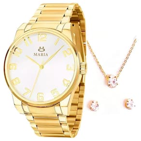 Relogio Feminino Aço Inox Dourado + Caixa + Brincos + Colar Casual Social Qualidade Premium Banhado Kit Completo Orizom Maria: Relógio Analógico Dourado + Acessórios Banhados Surpreenda a Maria da sua vida com este conjunto deslumbrante, projetado para realçar a elegância e o estilo dela. O Relógio Feminino Analógico Orizom Maria é uma verdadeira obra-prima, banhado em ouro e feito com aço inoxidável de alta durabilidade, enquanto o colar banhado em ouro adiciona charme e requinte ao visual. O pingente e o par de brincos em forma de coração, adornados com strass transparente, simbolizam amor e delicadeza em cada detalhe.