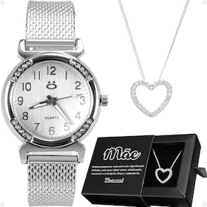 Não perca a chance de presentear a Maria (Mãe) da sua vida com este incrível kit especial! Kit Especial para Mães Relógio Feminino Orizom Maria Prata- Maquinário analógico em aço inoxidável- Pulseira em silicone ajustável- Tampa blindada personalizada com arte em forma de coração e a escrita "Mãe"Colar Feminino em Aço Inoxidável Prata- Detalhes elegantes- Pingente adornado com strass em forma de coração? Caixa Premium Orizom Maria com frase especial para sua Mãe ?Presente Perfeito para Sua Mãe Este kit é a maneira ideal de mostrar para sua mãe o quanto ela é forte, inspiradora e amada. Seu reconhecimento certamente trará lágrimas de felicidade! Um presente lindo, eterno e que agrada até os gostos mais exigentes.Joias Feitas à Mão com Acabamento e Luxo Garantidos Nossas joias são feitas à mão, uma a uma, para garantir o acabamento e o luxo que você e sua mãe merecem. Aproveite esta oportunidade para expressar seu amor de forma única e especial.Adquira já este kit exclusivo para presentear a Maria (Mãe) da sua vida!