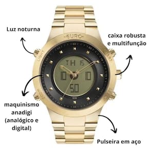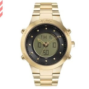 Gênero: Feminino Cor: Dourado Tipo de Movimento: Analógico/Digital Formato da Caixa:Redondo Material da Caixa: Metal Material da Pulseira:Aço Material do Vidro: Cristal Mineral Comprimento do Relógio: 22cm Espessura da Caixa: 1,5cm Dimensões da Caixa: 4,3m Nível de Resistência à Água: 5atm Peso gramas : 134 Pulseira Ajustável: Sim Calendário: Possui Cronógrafo: Possui Garantia do Fabricante: Garantia do relógio de 1 Ano.