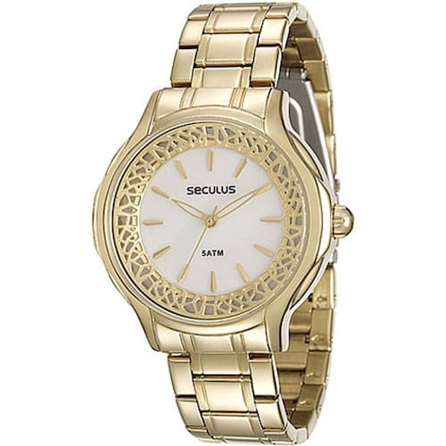 Relógio Feminino Analógico Seculus 28755LPSVDS1 Cor do Mostrador: Prata Tamanho da Caixa: 40mm Resistência à água: 5 ATM Função: Simples Cor da Pulseira: Dourada Formato da Caixa: Redonda Material da Caixa: Metal