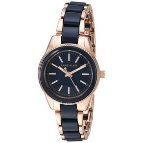 Relógio feminino Anne Klein em tom de ouro rosa e resina azul marinho — moldura com borda de moeda; mostrador azul marinho brilhante com ponteiros e marcadores luminosos em tom de ouro rosa; faixa de minutos externa impressa — Pulseira de elos ajustáveis em tom de ouro rosa com elos centrais de resina azul marinho; fecho e extensor de joias — Movimento de quartzo japonês — Diâmetro da caixa: 30 mm — Resistente à água até 30 m (100 pés): em geral, resiste a respingos ou breve imersão na água, mas não é adequado para nadar ou tomar banho — Tamanho da pulseira: padrão feminino